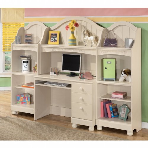 4PC Youth Bedroom Desk, Hutch, and Bookcase Set?This youth bedroom collection takes early American country design to create a fun and inviting cottage retreat perfect for any child's bedroom. The replicated light cream paint with subtle replicated brushing flows over the graphic leaf design patterns and bead board panel accents create a relaxing atmosphere that is sure to make any child feel at home. Create the special kid's bedroom with the refreshing design of this youth bedroom collection. Dimension: Desk: 45"W x 20"D x 30"H Hutch: 45"W x 12"D x 40"H Bookcase: 24"W x 16"D x 67"H Matching bedroom pieces are available and sold separately.
