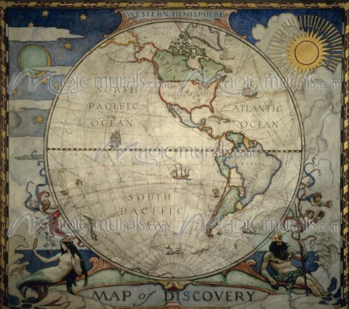 #N.C. Wyeth's painting of the Western Hemisphere. Artwork. National Geographic Collection / N.C. WyethThis premium wall mural is printed on QuikStik Plus® a heavy duty movable and repositionable self-adhesive vinyl wallpaper that is easy to install and reinstall - just peel and stick. QuikStik Plus® features an extremely low glare matte finish for more vibrant colors and eye-popping resolution. All mural materials and inks are fire tested and safe for families. Please note that QuikStik Plus® is designed for smooth interior walls and will not properly adhere to unpainted drywall or inferior paint, Teflon-coated or 'easy clean' wallpapers, exterior walls or surfaces exposed to extremely humid conditions.
