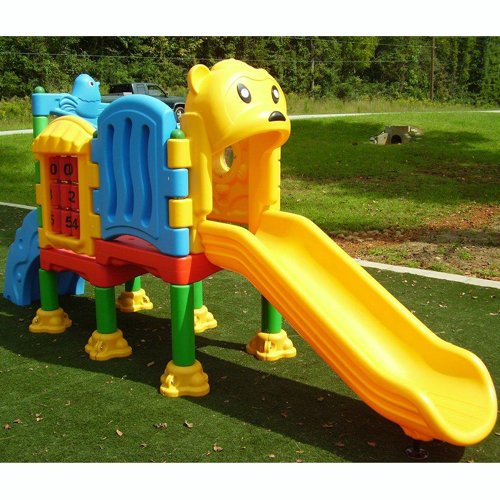 #The Kids Center #3 is a fun commercial playground structure for Pre-Schools. This cool new play system includes a slide, multiple game panels, a roof and a climber all in one affordable unit! Kid Center 3 is an easy to assemble and affordable unit for your Pre-School! This bright and colorful unit is made of a heavy duty plastic that includes UV protection for years of use!