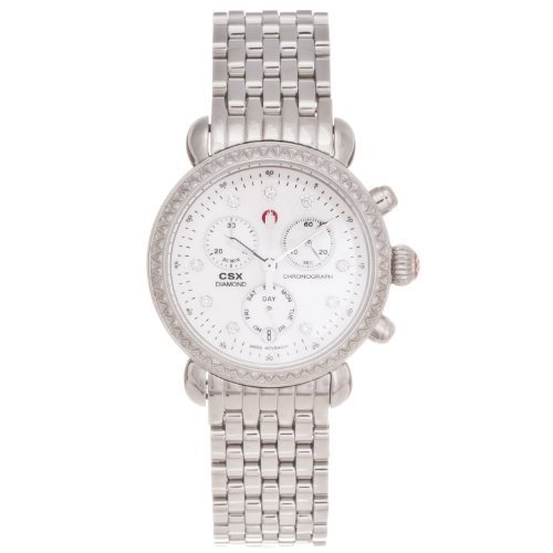 FeaturesCase: stainless-steel; Caseback: Stainless steel, screw-down; Bezel: stainless-steel, FixedDial: mother-of-pearl; Stone accents: Diamonds, Bezel, White; Hands: Hour, Minute, SecondMarkers: Diamond markers; Subdials: Second, Minute, Day of Week; Calendar: day-and-date, Round at 6:00Bracelet: stainless-steel, silver; Clasp: invisible-double-locking-clasp; Crystal: antireflective-sapphireWater resistance: 5 ATM/50 meters/165 feet; Womens watch bands can be sized to fit 6.5-inch to 7.5-inch wrists. Michele Women's 'CSX-36' Diamond Dial Chronograph Watch MW03M01A1046?