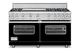 Viking VGCC5606GBK: 60" Custom Sealed Burner Range, Natural Gas, No Brass AccentViking Black Freestanding Gas Range VGCC5606GBK. Exclusive VSH (VariSimmer-to-High) Pro Sealed burner System. Front right burner equipped with TruPower Plus 18,500 BTU burner. Burners equipped with 15,000 BTU's. Exclusive VariSimmer setting for all burners. Exclusive all burners equipped with SureSpark Ignition System for consistent and reliable ignition. Automatic re-ignition. Surface burners light at any position on the knob and re-light if extinguished even on lowest setting. Heavy-duty metal knobs with stainless steel finish shipped standard. Exclusive combination of single 30,000 BTU U-shaped burner and infrared broiler with SureSpark Ignition System. GourmetGlo Infrared Broiler provides intense searing heat for broiling applications. Large-capacity ovens with six rack positions (see specifications for oven interior dimensions). Six high performance cooking functions for right oven. Natural airflow bake. Convection bake. Infrared broil. Convection infrared broil. Convection dehydrate. Convection defrost. All convection functions utilize the ProFlow Convection Air Baffle. Specifically designed to ensure balanced airflow for even heat distribution. Convection fan switch conveniently located on control panel. Heavy-duty broiler pan/grid. Two halogen oven lights for excellent visibility throughout the oven cavity. Exclusive one-piece tooled and porcelainized cooking surface for easy cleanup. Burner caps are easily removable for quick cleaning. Heavy-duty, porcelainized, cast-iron removable surface grates. Provides continuous front-to-rear, left-to-right surface for easy movement of large pots. One-piece control panel assembly easily removable for convenient front access. Commercial-grade, machined steel construction with Blanchard finish to retain cooking oils for stick-resistant cooking. Thermostatically controlled for precise temperatures. Exclusive cast grease trough holds 2-1/2 cups of liquid and can be easily removed from the front of the griddle for cleaning.