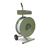 Heavy-duty portable Polypropylene/Polyester Strapping Cart handles either polypropylene or polyester hand strapping. Includes storage tray for tools and seals. Brake on reel. Two rubber wheels.